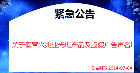 三、 嚴(yán)正聲明:凡假冒興兆業(yè)光電名義的單位或個人,必須立即停止一切侵權(quán)行為。興兆業(yè)光電保留進(jìn)一步追究其法律責(zé)任的權(quán)利。同時歡迎各位代理商、分銷商、消費(fèi)者和其它知情人員踴躍檢舉不實宣傳與不實銷售活動,對遭遇的違法行為及時報警。謝謝合作!