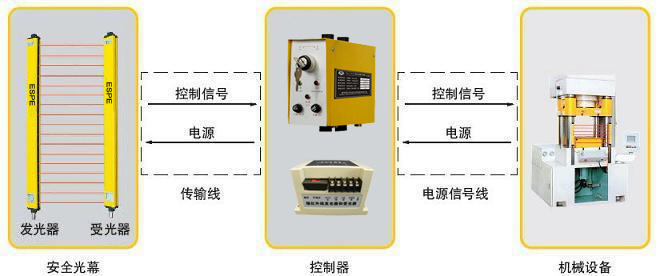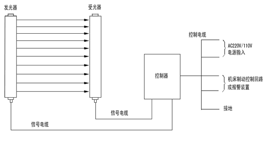 安全光幕發(fā)光器發(fā)出的光直射到受光器,形成保護光幕。當安全光幕被遮擋時,受光器產(chǎn)生一遮光信號,通過信號電纜傳輸?shù)娇刂破?,控制器將此信號進行處理,產(chǎn)生一控制信號,控制機床的制動控制回路或其它設備的報警裝置,實現(xiàn)機床停車或安全報警。