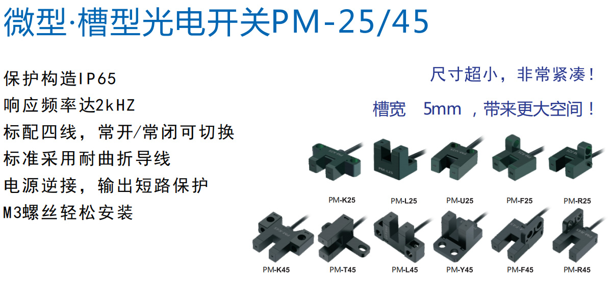 與接近開關(guān)等比較,光電開關(guān)的檢測距離非常長,且是無接觸式的,所以不會損傷檢測物體,也不受檢測物體的影響。幾乎不受檢測物體的制約由于是采用對檢測對象的表面進行反射及光透過方式,不像接近開關(guān)只能對金屬,還能對玻璃、塑料、木制物體、液體等各種物質(zhì)進行檢測。