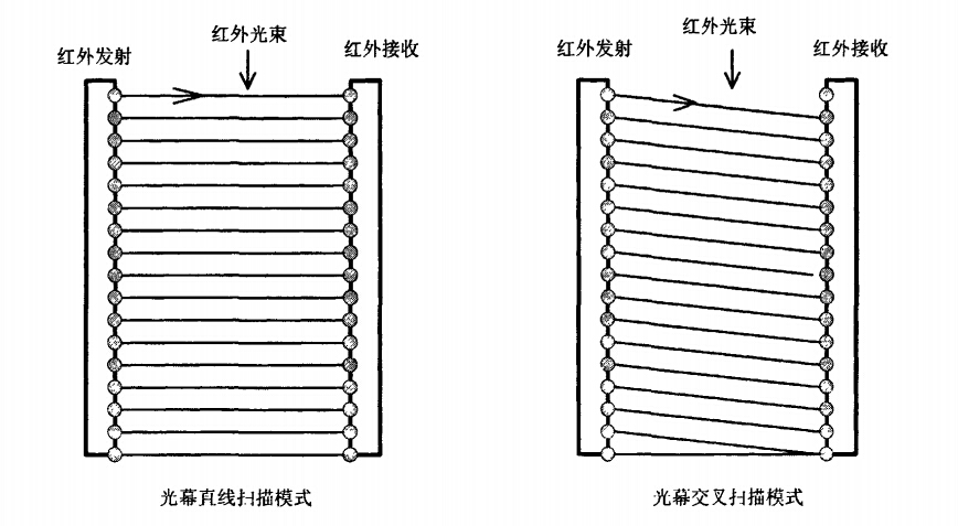 常用的檢測光幕掃描模式有兩種,分別為直線掃描模式和交叉掃描模式。前者是最常用和最簡單的測量光柵掃描模式,發(fā)射器連續(xù)生成定間距的光線陣列,依次由始至終平行排列,并由收光器對應(yīng)一一接收。在直線掃描光線問交錯排列有傾斜光線。第一束傾斜掃描光線于發(fā)射器第二通道和收光器第一通道之間建立;第二束傾斜掃描光線于發(fā)射器第三通道和收光器第二通道之間建立。依此類推,直到最后一束傾斜掃描光線于發(fā)射器最后通道和收光器終點前一通道間建立。發(fā)射器最后通道在發(fā)射傾斜光線后再次被激活,發(fā)射直線光線至收光器最后通道,從而完成整個掃描過程。采用交叉掃描模式可提高光學(xué)分辨率,在檢測區(qū)域中間1/3部分的精度最高,最小檢測物體尺寸可縮小為直線掃描時的2/3。